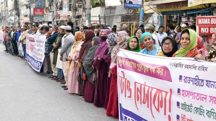 আজ শনিবার বেলা সাড়ে ১১টায় নগরের সাহেববাজার জিরো পয়েন্টে রাজশাহী স্বার্থ সংরক্ষণ কমিটির আয়োজনে অনুষ্ঠিত এই মানববন্ধনে বিভিন্ন সামাজিক ও নাগরিক সংগঠনের নেতারা অংশ নেন।